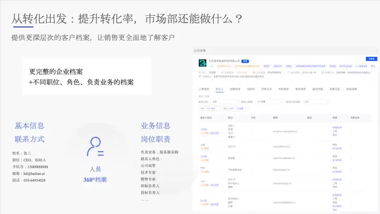 在中国做生意是熟人社会,陌生人建立起买卖关系非常困难,尤其是中大型客户。以往想要拿到大客户的联系方式,销售可能要在天眼查、企查查搜索,找熟人各种打听。这种方式效率非常低。百炼智能是这么为用户赋能的:我们整理好互联网上所有合法公开的信息,形成更深层次、更完备的企业关系人脉网,并基于目标客户画像为用户主动推荐销售线索。