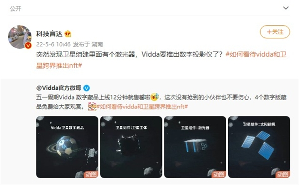 据了解,海信旗下年轻潮牌Vidda在五一假期联合国星宇航推出了一款联名数字藏品,总共发行10000份,每份售价29.9元。4月30日20:00上线后,仅12分钟即被网友抢购一空。而从Vidda官微放出的动画来看,这组数字藏品包含一个完整版的卫星和三个零件。完整版卫星在虚拟的宇宙中运行,并且能在太空中投出有卡塔尔世界杯授权的图像,让这颗卫星像极了一个太空中的投影机。而其中一个激光器零件,更是被网友认为是做实了Vidda即将推出激光投影产品。