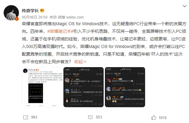 一石激起千层浪,赵明的发文瞬间引起了数码圈、科技圈的热议。不少博主纷纷表示,“荣耀将发布Magic OS for Windows,或许会开启技术竞争的新航道。”“四年前吓人的技术,这次会在新品上同步发布吗?”“期待全新的荣耀笔记本。”