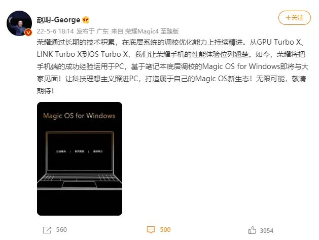 5月6日,荣耀CEO赵明微博发文:“荣耀通过长期的技术积累,在底层系统的调校优化能力上持续精进。从GPU Turbo、LINK Turbo到OS Turbo X,我们让荣耀手机的性能体验领先行业。如今,荣耀将把手机端的成功经验运用于PC,基于笔记本底层调校的Magic OS for Windows即将与大家见面!让科技理想主义照进PC,打造属于自己的Magic OS新生态!无限可能,敬请期待!”