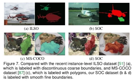 与实例级ILSO数据集(a)和MS-COCO数据集(c)相比,我们的SOC数据集(b&d)可标注精细、平滑的边界