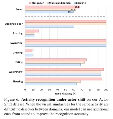 当同一活动的视觉相似性在不同领域间难以发现时,我们的模型(红色)可以使用来自声音的额外线索来提高识别精度