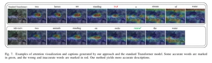 我们的方法(下排)和标准Transformer模型(上排)生成的注意力可视化和图像描述示例。一些准确的单词用绿色标记,错误和不准确的单词用红色标记。我们的方法可得到更精确的描述。