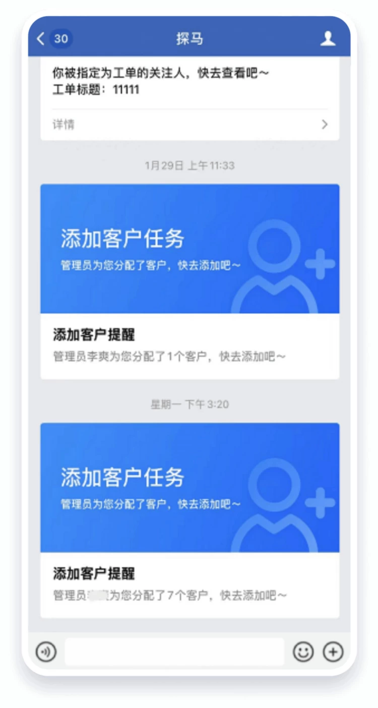 客服在使用探马SCRM系统后,Excel批量上传线索到【待分配客户库】中,根据客户的地理位置、咨询意向等,批量分配给不同地区律所对应的谈案律师跟进。同时,后台可查看线索的分配记录,帮助回溯分配情况,避免产生纠纷。在客服分配线索后,谈案律师将实时在企业微信收到“添加客户任务”的通知,提醒及时领取线索,便于他们在第一时间就能沟通客户,减少客户等待时间,提升客户体验感。
