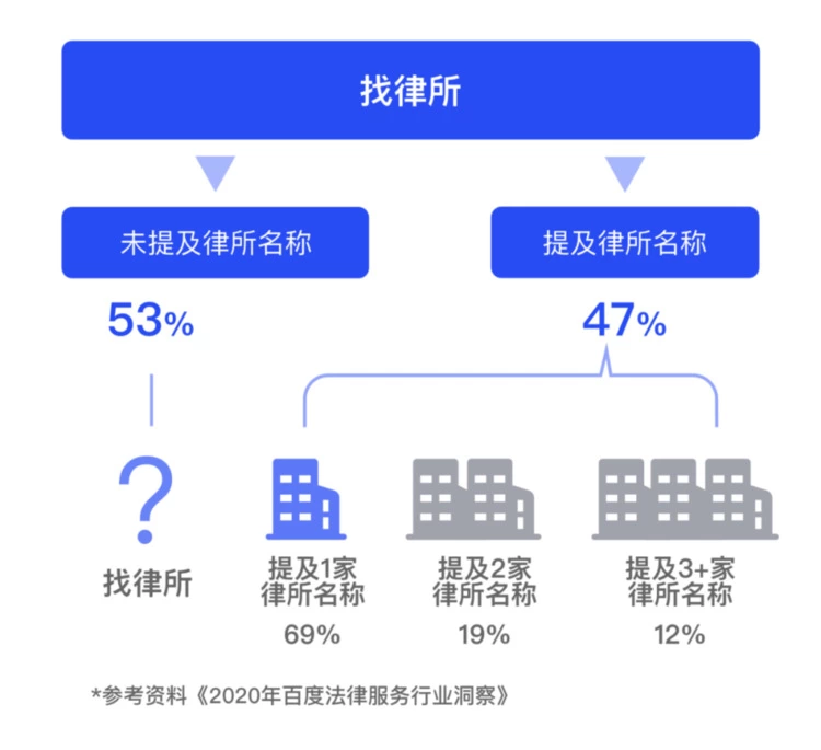 据统计,有47%的用户在网络搜索时,会直接提及律所名称。可以看出,用户在寻找法律咨询服务时,非常关注律师或律所的知名度和专业性。律师事务所需要建立自己的私域阵地,加强律所本身和律师个人的品牌建设,了解用户真实需求,与用户建立互动与信任,促进转化。