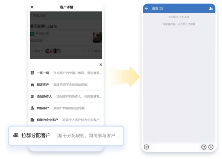 谈案律师先和当事人做初步的沟通,了解当事人咨询案件的基本情况后,再转交给能够处理案件的办案律师。使用探马SCRM系统后,这个转交客户的流程变得简单多啦。在企微手机端选择【拉群分配客户】,基于客户分配规则,无需手动邀请,点击一次即可将自己、当事人和办案律师自动拉入服务群聊,便于当事人与办案律师直接沟通,大幅提升客户服务的协作效率。