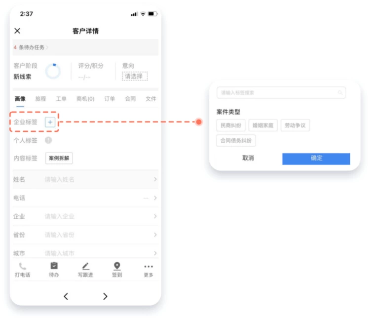 用户的法律咨询需求差异性大,如合同债务纠纷、劳动纠纷、婚姻家庭、刑事案件等等,要明确客户需求,才能解决客户的问题。在企微侧边栏,可以填写客户的基本资料信息,平时点开即看,便于迅速掌握客户基本情况。每个客户的需求不同,为了提供更精准与更优质的法律服务,可以为客户打上【客户标签】,完善客户画像。运营人员提前在探马SCRM后台设置好标签和标签分组,谈案律师和办案律师就可以直接在企微选择标签,而不用手动输入,记录客户的真实需求。