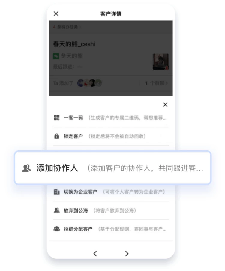 在律师事务所内,客户需要经过多次流转,从客服到谈案律师再到办案律师,共同为客户提供服务。这时,可以添加自己的同事为【协作人】,协作人不用客户同意即可添加好友成功,给客户节省了不少麻烦。客户资料与以往的跟进记录都可以直接同步,帮助协作人快速了解客户情况,减少沟通时间,避免重复询问客户信息,提升客户体验。