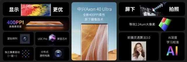 新机屏下摄像区屏幕采用400PPI高像素密度,全屏蓝钻排列,视觉融合效果更加完美;业界首发独立像素一驱一技术,每个像素单元都由单独的像素电路驱动,屏幕显示更清晰精细。电路采用分布式透明走线,消除屏下区边缘电路聚集,画面呈现更平滑自然。UDC Pro屏显芯片进一步升级,融合MRC算法升级和智能像素增强、智能显示优化技术,令显示更为精准、同步。凭借全新100%无缺全面屏,中兴Axon 40 Ultra带来更完美的沉浸式观感,每一眼皆为大场面。