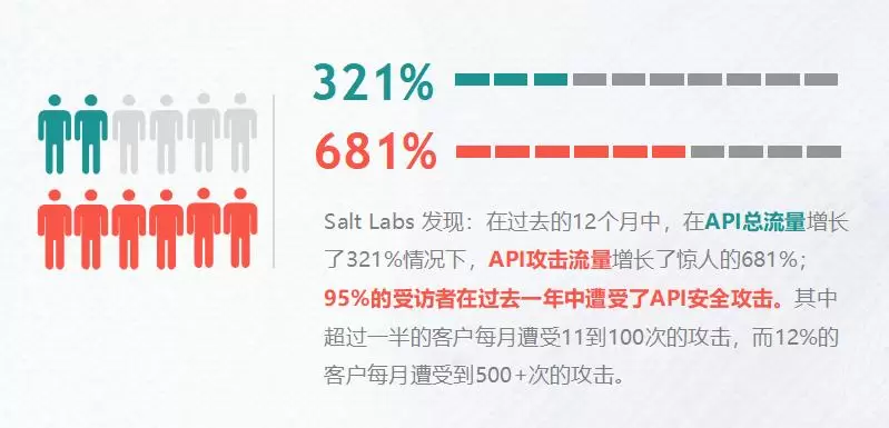 API自身的无状态性、对请求中资源的可识别性、删除/修改服务端资源的可操作性、以及服务端返回的足够详细的信息所带来的资源暴露面的扩大等,这些脆弱性成为API被攻击的天然漏洞,都促使API的攻击数量呈指数级增长。