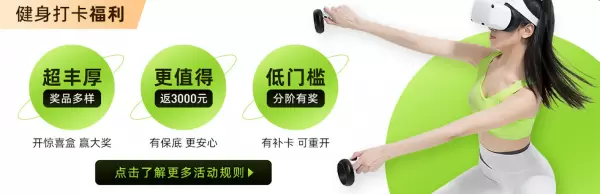 用户在收货后1个月内联系奇遇官方店铺客服领取活动激活码,并在7个自然日内使用激活码完成活动激活即可参与活动。在此期间玩家使用机器体验VR内容,机器将自动记录对应的动作姿态并计算运动量,当有效运动时长最低达到30分钟即可达到打卡标准,系统自动完成打卡。每轮打卡设立连续完成30天、100天、300天三个目标,每完成一个目标可获得一个奇遇惊喜盒。