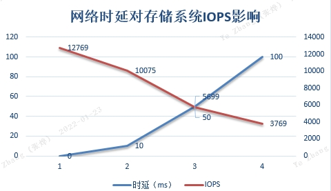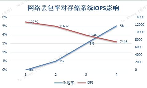 在一个分布式存储系统中,单个节点网络丢包率或网络时延增加时,存储系统的性能会极快速的下降,5%的丢包率或50ms时延,就足以使存储系统性能下降一半左右。