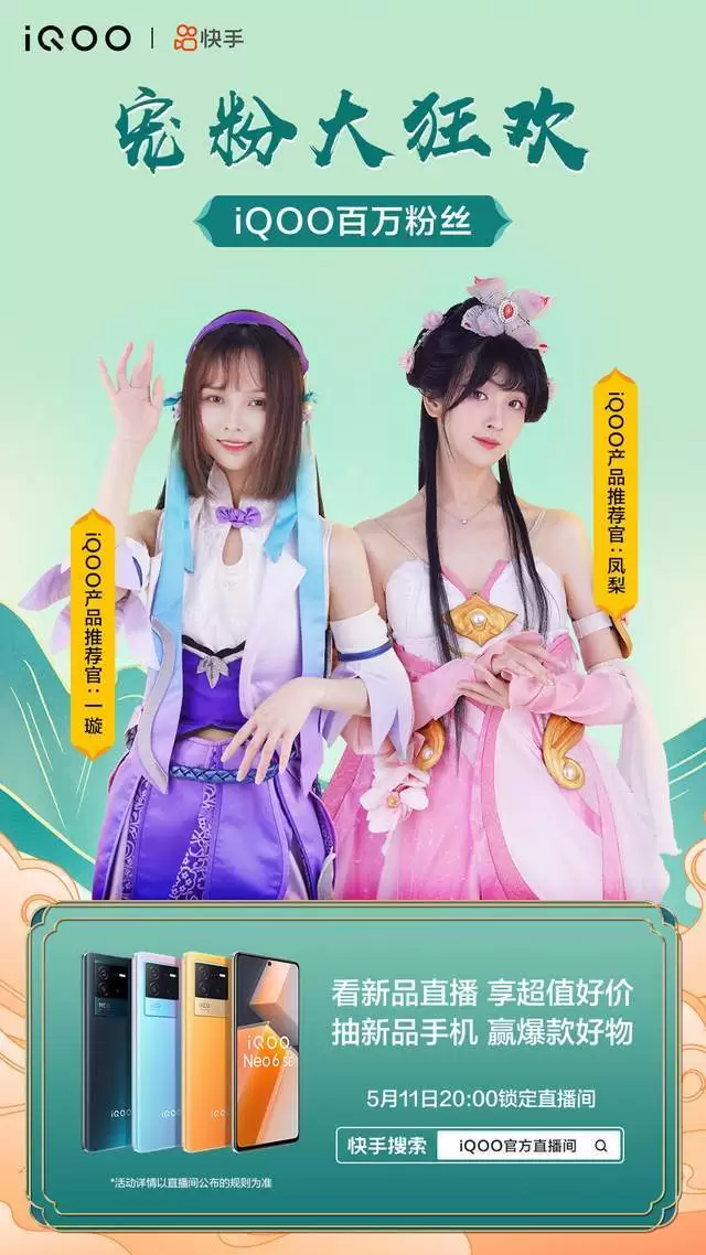 作为备受年轻用户喜爱的品牌,如今iQOO快手直播间粉丝量也突破了200万大关。而就在5月11日晚20:00,以“实力宠粉”著称的iQOO,将在快手iQOO官方直播间、携手盘子女人坊带来古风专场直播!其中,盘子女人坊是一家以中国风艺术体验为特色的综合型文化产业集团,旗下拥有“盘子女人坊”中国风文化摄影、“凤绫儿”、“从一汉服”中国风儿童摄影三大自主品牌,并致力于成为集文化、娱乐、体验式消费、传媒为一体的“东方迪士尼”。在专场直播活动中,直播间也将持续送出福利,购机还有机会抽iQOO Neo6 SE新品手机!