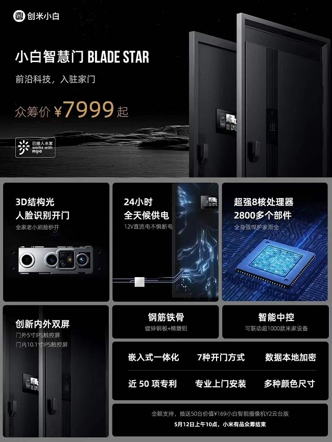 4月14日创米推出小白智慧门BLADE STAR,更进一步探索怎样让门的智能真正落到实用,并创下24天众筹超300万的销售额。此次众筹将于5月12日10点结束,小白智慧门BLADE STAR将恢复12999元起的零售价。