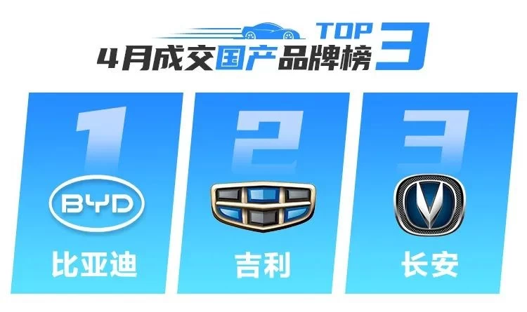 4月份国产品牌二手车成交量榜单变动较大,比亚迪重夺冠军宝座,吉利、长安分列二、三位,上月排名第一的长城哈弗跌出前三。其中,比亚迪依靠亲民的价格和过硬的产品实力以及DM-i超级混动、刀片电池等领先技术,获得了更多消费者的认可和关注。