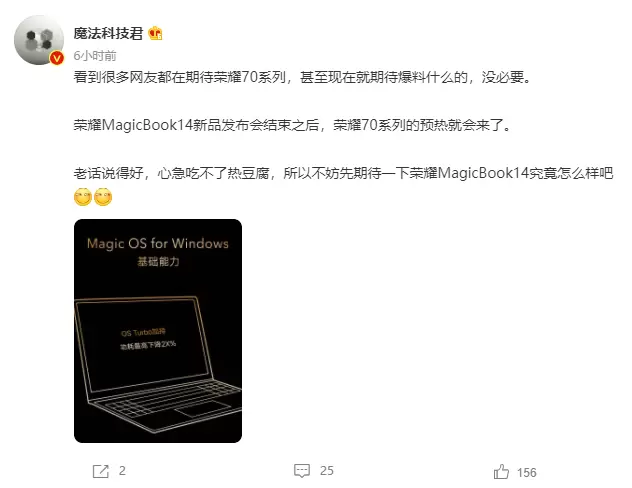这一周,从Magic OS for Windows启动界面和参数图的露出,到新品真机曝光,笔电圈内外的大V爆料和小道消息不断,当然,一切都随着荣耀5月9日的官宣尘埃落定。几天以来,荣耀笔记本即将上新的重磅消息可谓牢牢占据了笔电圈C位,余热直至今天也未散去,还有很多KOL和网友在对荣耀笔记本MagicBook 14的其他功能点、外观设计和价格进行猜测。前几日率先曝出Magic OS for Windows图标的“魔法科技君”再次发声,称“心急吃不了热豆腐,不妨先期待一下新品究竟如何吧~”