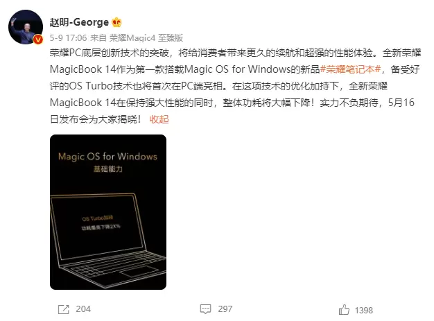 作为OS Turbo在PC端的首秀,同时也是首款搭载Magic OS for Windows的荣耀笔记本,荣耀MagicBook 14不仅肩负着品牌在PC端市场开拓新境的使命,同时也将为市场注入全新的血液,引领行业创新变革的新思路,5月16日的新品发布会,全新的荣耀笔记本,值得一同期待。