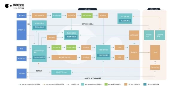 - Target(SoC)SDK提供在SOC上的运行时环境和主机端的编译环境,实现了异构计算单元实时任务调度器、传感器接入与管理服务SensorManager、高精度时间同步服务、多传感器融合服务和ADS诊断服务。BST ADS-Platform所有服务和任务节点的通信都基于BST ADS-COM通信中间件,可以在进程内/进程间/异构计算单元间/跨主机间实现高性能DDS通信,同时可以兼容CyberRT、ROS等中间件生态;