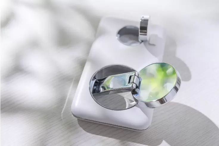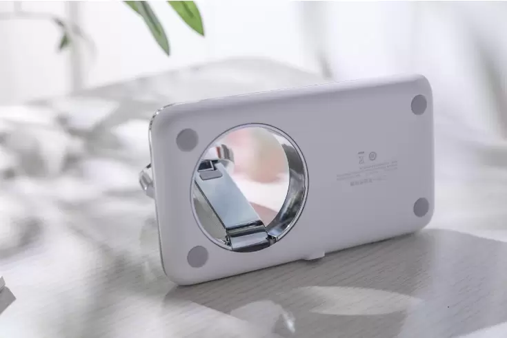 手机充电模块和支撑杆用的是锌合金材质,表面就像镜面一般光滑透亮,乍一看就好像女生补妆的小镜子!不得不说,这样的设计对女生真的很有“杀伤力”,我的同事小姐姐就是冲着这个颜值也去买了一个。