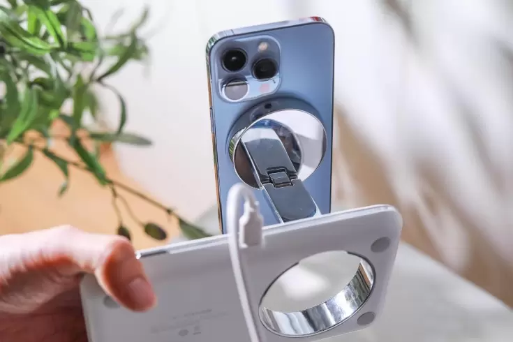 折叠式支架的设计是它的一大亮点,用手指从底下轻轻一推就能将手机充电模块立起来。