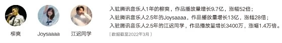 而对于各大音乐平台而言,通过站内流量倾斜、多样化商业变现、多维度助力的方式,让行业从“推歌”走向“推人”是他们最主要的升级方式之一。《白皮书》中数据展示,截至2022年3月,入驻腾讯音乐人一年的柳爽,作品播放量增长9.7亿,涨幅高达52倍;入驻2.5年的Joysaaaa和江迟同学,作品播放量分别增长13亿和3400万,涨幅分别达到28倍和1.4万倍。TME用歌曲带动音乐人提升知名度,并配合站外运营,真正帮助音乐人“走出来”。