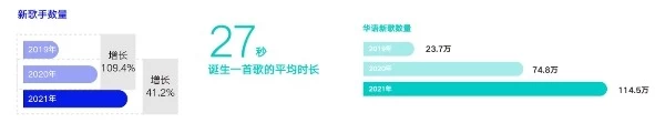 在供需两侧对音乐服务强烈的价值需求下,音乐人服务逐渐走入改革的“深水区”。互联网让音乐生产和传播的门槛大幅降低,新人歌手的数量大规模增长,各种各样的宣发渠道也丰富起来。据《白皮书》显示,在2021年,新歌手数量与2020年相比增长41.2%,华语新歌数量首次突破百万,每27秒就会产出一首新歌。不难看出,在生产力下沉、门槛降低的同时,音乐内容市场的竞争也逐渐加剧,音乐宣发的成本也会大幅提高。