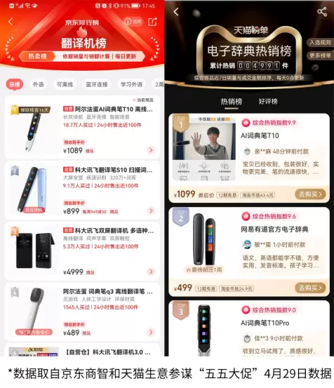 市场端的表现同样亮眼。4月29日,京东商智和天猫生意参谋“五五大促”数据显示,阿尔法蛋AI词典笔T10双平台销售额第一。