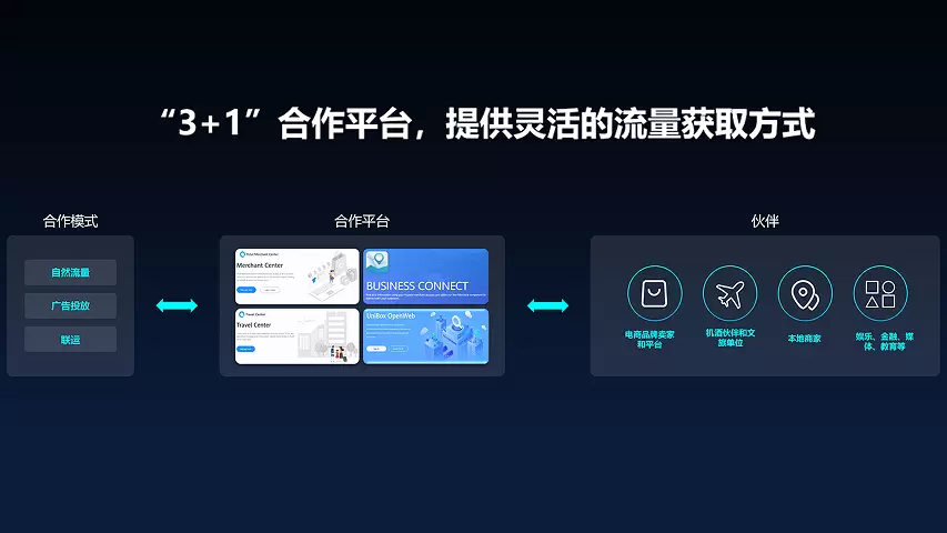 为了更大范围将企业的产品和服务拓展至全球,搜索引擎作为聚合性的流量中心入口,Petal Search搭建了“3+1“内容合作平台,为全品类合作伙伴提供产品和服务的接入,获取“即搜即得”的自然搜索流量,包括购物垂类的Petal Merchant Center平台,旅游垂类的Petal Travel Center平台,本地生活服务的Business Connect平台,以及适用于娱乐、金融、媒体、教育等的 UniBox开放平台,帮助企业快速建立起基础的用户流量池,同时也能实现商品和服务的分发。基于用户主动“搜”,在关键词和内容匹配的情况下,产品和服务能更精准地推送给用户,让用户在搜索的过程中自然而然地从“搜”到“逛“。