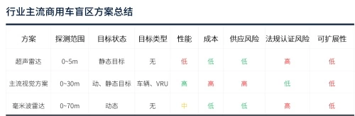 以商用车盲区方案为例。据数据统计,商用车事故约有35%与视觉盲区有关。目前国际上主流的商用车盲区解决方案主要以超声雷达方案、毫米波雷达方案及视觉方案为主,但这些方案在功能、性能、成本、可扩展性等方面无法全面满足需求。比如,超声波雷达方案的探测范围小,对快速移动目标的探测能力有限,并且无法辨识目标类别;毫米波雷达方案一般横向运动与定位估计精度不高、对行人的感知能力不强;现有基于视觉光流法的方案也存在探测范围小、无法辨识目标类型、无法处理静态目标等问题。