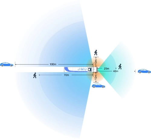 JIMU S7 可对盲区进行360°精准可靠无死角监控,左右盲区纵向探测距离达70m, 前向盲区探测距离达40m,横向探测范围超过10m,大幅提升驾驶安全。