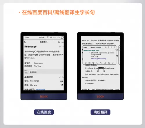 文石BOOX Neo-reader阅读系统拥有非常完善且人性化的阅读功能,能直接支持的格式多达30多种,无需格式转化直接阅读,几乎没有它打不开的电子书。在BOOX V2引擎下,各种排版样式都能原版呈现,包括一些那些含有多字体、超链接、图文混排、古籍排版的电子书,都能让你原汁原味进行阅读。系统内置多种字词典、翻译引擎等,在阅读过程中选中查词、选词翻译都非常轻松方便。
