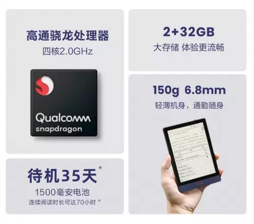 最后再来简单说说产品的配置:Poke4和Poke4S两款产品均配备了高通四核2.0GHz CPU,Poke4采用2GB+32GB超大存储组合,毫无疑问是6英寸墨水屏的顶级配置。Poke4S则拥有2+16GB内存容量,可容纳上万本图书,二者均可支持至大512G OTG内存拓展。两款产品的电池容量均为1500mAh,充满一次电可以连续使用70个小时,待机时间长达一个月以上。