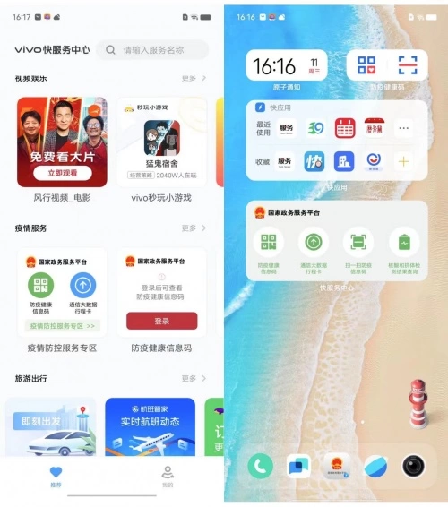 (左图:vivo快服务中心界面。右图:vivo手机桌面快应用相关原子组件)