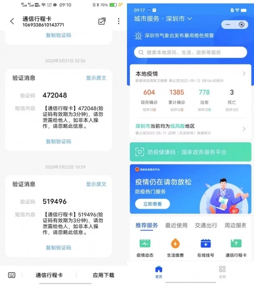 (左图:vivo手机短信-疫情服务菜单;右图:vivo城市服务快应用—首页)