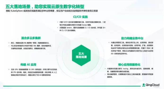 为了满足企业的多种业务需求,保证企业可以自由组合选择服务,加快云原生转型,青云QKE聚焦五大落地场景: