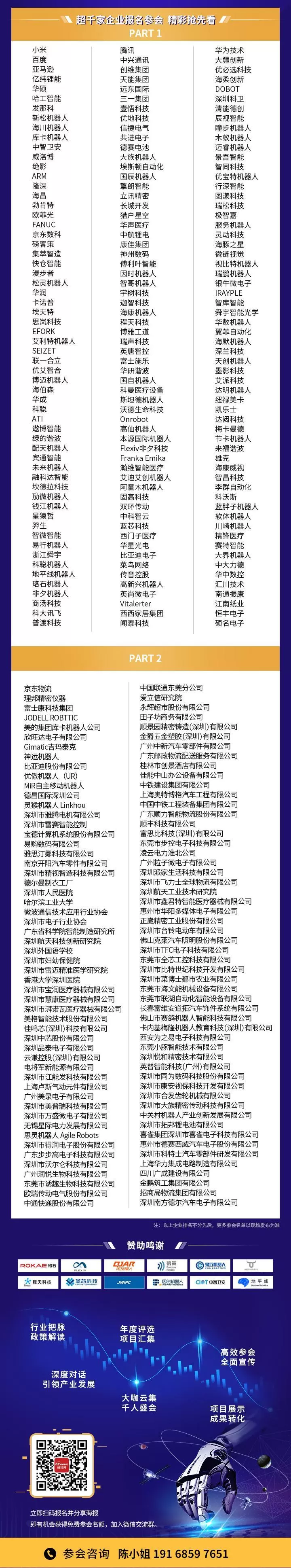 参会对象皆为机器人行业专业人士,除了本体制造商、核心技术提供商外,还会邀约减速机、伺服电机、控制器、芯片等上游企业,系统集成商、分销商、代理商等下游企业,3C电子、汽车零部件及整车制造、金属机械加工、食品包装、物流配送等应用行业知名用户,此外还有金融投资、行业协会、科研机构、高等院校等行业相关企事业单位。