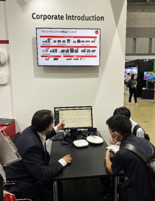 日本第十三届东京教育综合展览会(EDIX Tokyo)新华三展区,工作人员现场做demo演示和讲解