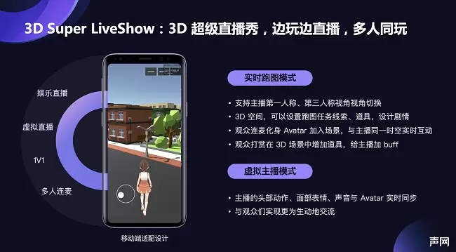 3D 超级直播秀玩法为主播提供了一种创新吸粉方式,也能有效降低内容生产门槛。主播边跑图边直播,观众可以连麦化身 Avatar 加入当前 3D 场景,通过打赏的形式给主播增加道具或 buff,与主播一同完成任务线索。在跑图过程中,主播也可以一键切换为虚拟形象模式,与用户实现更为生动地互动。在该玩法中,声网可配合企业按需定制不同风格的虚拟形象(如卡通全身、超写实半身、二次元半身等)和 3D 场景,助力企业和开发者打造更富创新的直播互动营收模式。