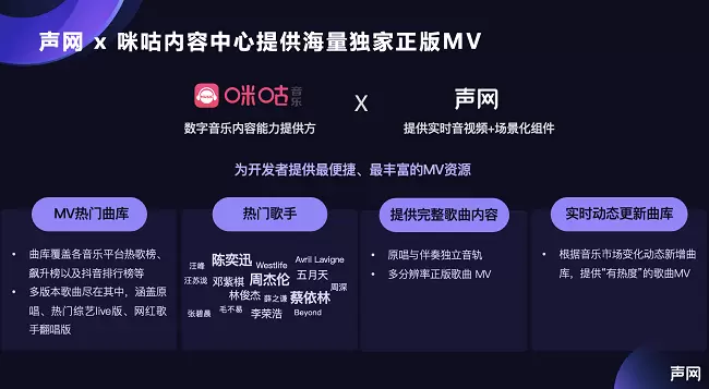 与在线 K 歌房不同的是,MetaKTV 解决方案提供了 3D 场景,用户无需再紧盯当前播放歌曲、歌词的手机屏幕。在百变风格的 3D 场景中,用户有自己的虚拟形象化身、也有更多的互动形式,如跳舞、打call 等,在 K 歌的同时也能与好友互动,轻松让气氛 high 起来。同时,在 3D 空间音频的加持下,用户能尽享“声”临其境的 K 歌体验。企业和开发者无需担心 MV 曲库质量,通过与咪咕音乐达成合作,MetaKTV 解决方案 MV 曲库资源已覆盖各音乐平台热歌榜、飙升榜以及排行榜,并提供多分辨率歌曲 MV,最高可达1080p。更有MV视频播放、歌曲打分、美声音效、录制分享等九大 K 歌场景化功能,完美还原线下 K 歌体验。