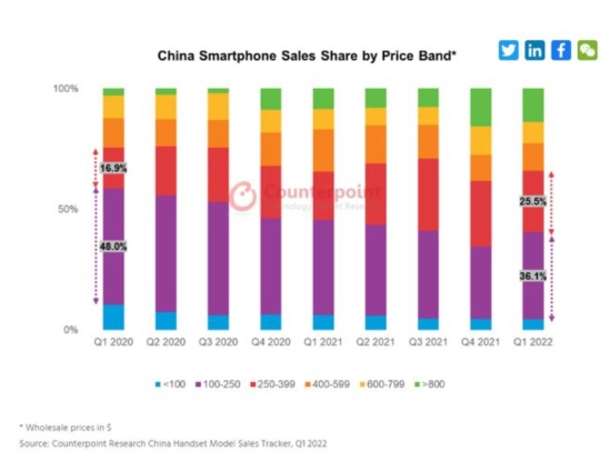 Counterpoint:Q1中国中高价位段智能手机市场份额增长10%,vivo位居第一