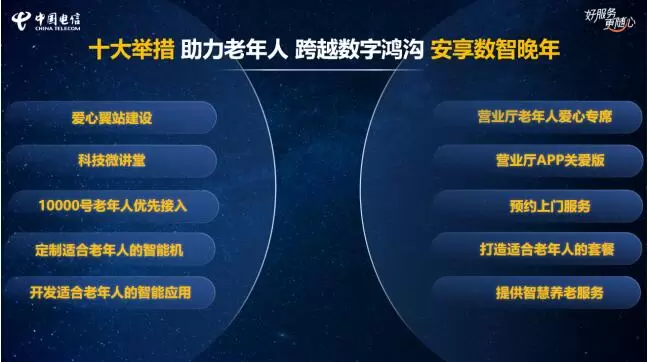 恰逢今年517电信日的主题,是面向老年人和实现健康老龄化的数字技术。山东电信响应政府号召,彰显央企担当,推出营业厅老年人爱心专席、老年人关爱版线上营业厅、10000号客服老年人优先接入、预约上门服务、爱心翼站、科技微讲堂走入老年人群、老年人定制智能终端、老年人智能应用、老年人套餐、智慧养老等10项关爱服务举措。