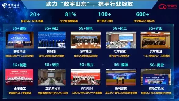 山东电信紧紧把握近年来通信信息产业的大变革、大融合的发展趋势,积极发挥自身优势,参与山东省各行各业信息化建设,打造行业数字化平台,覆盖工业互联网、智慧教育、智慧医疗、数字政府等多个领域,打造了青岛供电公司“5G+智慧电力”、日照港“5G智慧港口”、山东汇丰石化“5G智慧炼钢厂”、赛轮集团“5G轮胎工业互联网”等累计106个5G商用场景。2022年计划实现120+的5G商用项目落地,积极赋能传统产业转型升级。