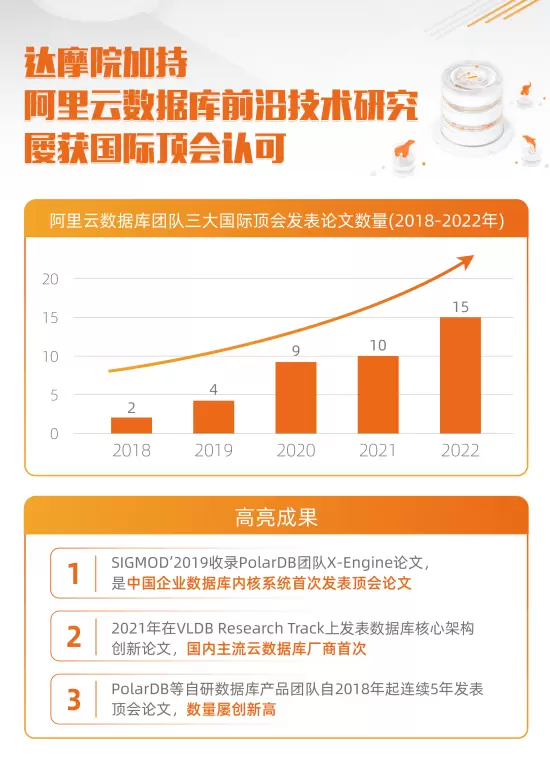 事实上,在类似良性互动中,阿里云数据库收获颇丰。在学术论文方面,过去几年阿里云数据库团队在国际顶级会议上发布的论文数量不断创下新高,从2018年的2篇增长到2022年的15篇;在技术产品化方面,阿里云数据库获得了近千项专利,实现自研数据库拥有存储计算分离、三层解耦、多主架构、HATP、Serverless、一体化分布式、全加密、智能与自治化等创新能力;在商业化落地方面,阿里云数据库经受住了双11最严苛的检验,PolarDB创造峰值1.4亿次/秒数据库处理峰值(TPS)纪录;PolarDB、AnalyticDB、RDS等云原生数据库产品深度服务国家医保信息平台、自然人税收管理系统等重大国计民生项目。