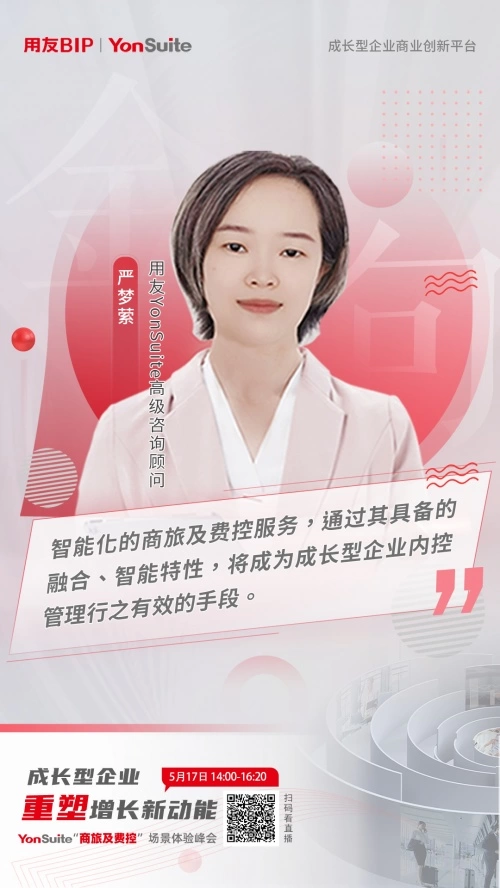 严梦萦说到:“智能化的商旅及费控服务,通过其具备的融合、智能特性,将成为成长型企业内控管理行之有效的手段。用友YonSuite提供了从商旅预定、交易到业务报销、会计处理的一体化管理能力,可以让企业在享受便捷商旅的同时,加强对费用支出的控制,进一步的实现成本可控、业务可管、效益可见。“