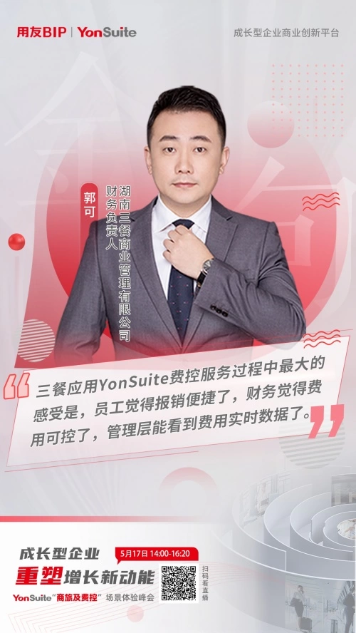 目前YonSuite的费控管理也为上千家企业提供了服务,湖南三餐商业管理有限公司财务负责人郭可先生带来了主题为“三餐商业数智费控管理实践”的分享,“三餐应用YonSuite费用管控最大的感受是,员工觉得报销便捷了,财务觉得费用可控了,管理层能看到费用实时数据了。管理上实现了业财融合,做到了流程规范控制,数据互通,财务核算统一”。