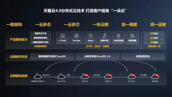 2021年11月,天翼云发布了4.0分布式云,实现了一云多态、一云多芯、一张云网、一致架构、统一调度、统一运维。产品与技术的升级,带来天翼云算力、存储、网络的全面提升。本次创新成果发布会,是天翼云从构建“分布式云”到实现“一朵云”理念的进一步解读。江峰认为,天翼云4.0直面客户业务场景多元化的需求,采用分布式技术架构,推进天翼云“2+4+31+X+O”的层次化布局演进,让客户可以将业务按需部署在客户现场、边缘云、中心云等节点上,从客户视角来看,仅用“一朵云”,就能充分满足自身不断变化的用云需求。通过在分布式云数据库、云操作系统、弹性计算、云存储、云网络、CDN等关键技术领域中取得的突破,天翼云4.0实现公有云、私有云、专属云、混合云、边缘云多种形态云服务,做到“一云多态”、“一云多芯”式的全场景覆盖。