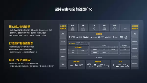 作为云服务的“国家队”,天翼云走过十年科技创新之路,完成了从过去商业系统到自研系统的转变,形成资源布局和自研产品能力双优势。天翼云坚持IaaS+PaaS关键技术全栈自研,包括定制化的宿主机操作系统CTyunOS、云操作系统CloudOS4.0、自研智能网卡、数据库等关键核心技术和软件。同时在云服务细分领域打造国产化垂直生态,担起算力国产化发展的责任,推进国企、央企上云,帮助行业用户实现数据无忧、安全无忧。
