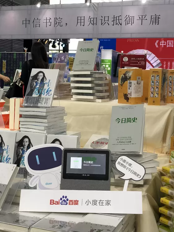 2018年7月20日,第28届全国图书交易博览会(简称“书博会”)现场,以色列历史学家、畅销书作家尤瓦尔·赫拉利的最新作品《今日简史:人类命运大议题》全球首发。百度也与中信书院合作,首发《今日简史》有声书,读者可以在小度在家获取有声资源,享受AI时代不一样的服务内容与体验。不少读者体验后,现场直接下单购买小度在家,把优质的对话式AI体验与精彩的内容资源打包带回家。