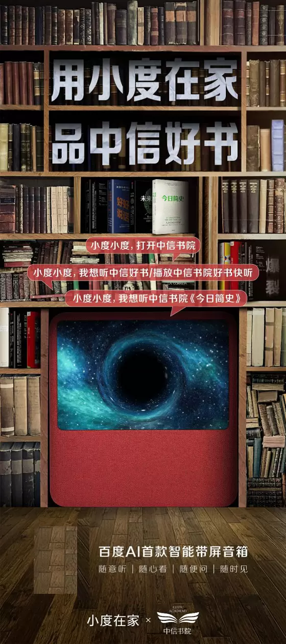 即日起,用户就可以在小度在家上获取《今日简史》有声书的全部内容。用户说出“小度小度,打开中信书院”,小度在家会打开“中信书院”技能,显示书籍列表。此时对照书名,用户继续说“小度小度,播放《今日简史》”,它就会播放对应的内容。中信书院的其他精彩作品,也可以通过百度人工智能设备欣赏到。
