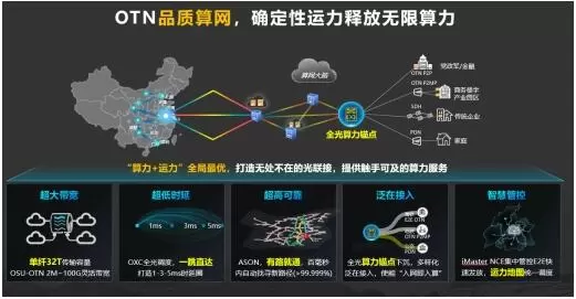 三是算网融合。OTN品质算网能够感知业务的算力诉求,包括感知地址、感知流量,感知应用类型,然后通过全新的业务感知协议驱动OTN连接的按需自动创建、带宽无损调整,以保证行业客户的极致体验。同时,通过算和网的管控系统融合,实现算网一体化管控,一体化编排,以此打造算网运力地图,实时呈现入算连接的带宽、利用率、时延等信息,同时可以基于行业客户的算力诉求和联接诉求,算网大脑可以选择匹配的算力中心以及最优的联接,实现算力“一点接入、随用随取”。